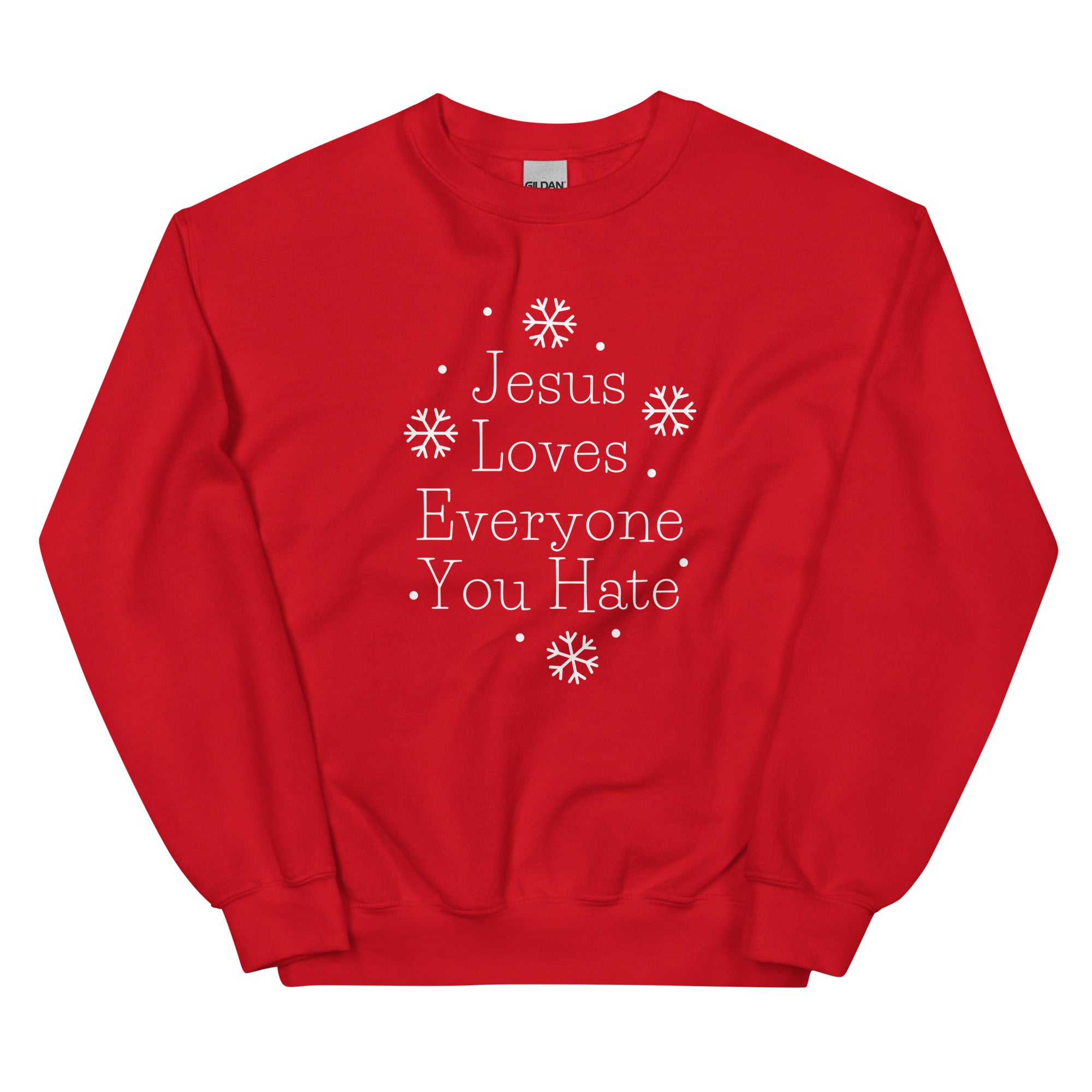 Jesus loves everyone you hate! Add this limited edition political Christmas sweatshirt to your collection.